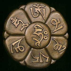 Om mani padme hum mantra of six syllables in Sanskrit particularly associated with the four-armed form Shadakshari Avalokiteshvara (Chenrezig Tibetan, Chinese Guanyin), the bodhisattva of compassion.